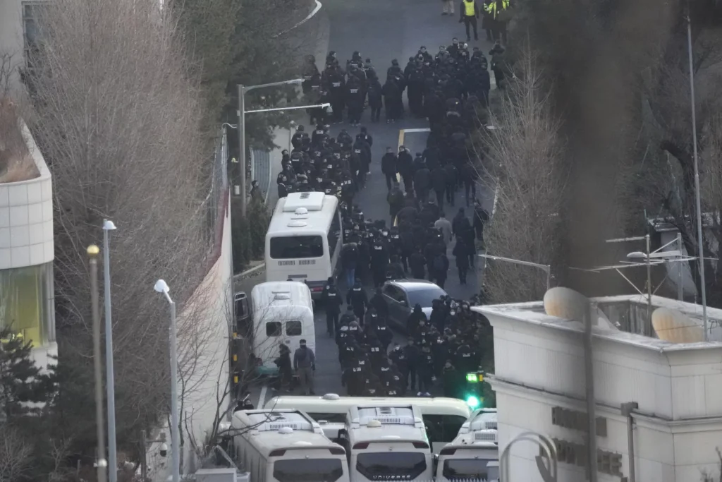 Meskipun ada surat perintah pengadilan untuk penahanan Yoon, dinas keamanan presiden bersikeras bahwa mereka berkewajiban melindungi presiden yang dimakzulkan dan telah membentengi kompleks tersebut dengan kawat berduri dan barisan bus yang menghalangi jalan.