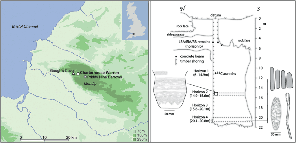Situs ini pertama kali digali pada 1970-an dan 1980-an, tepatnya di Charterhouse Warren Farm Shaft (CWFS), sebuah poros alami sedalam 20 meter yang terletak di dataran tinggi batu kapur Carboniferous di Perbukitan Mendip. Dua kampanye penggalian dilakukan antara 1972–1976 dan 1983–1986, membagi lokasi ini menjadi beberapa lapisan atau horison, masing-masing dengan temuan yang berbeda.