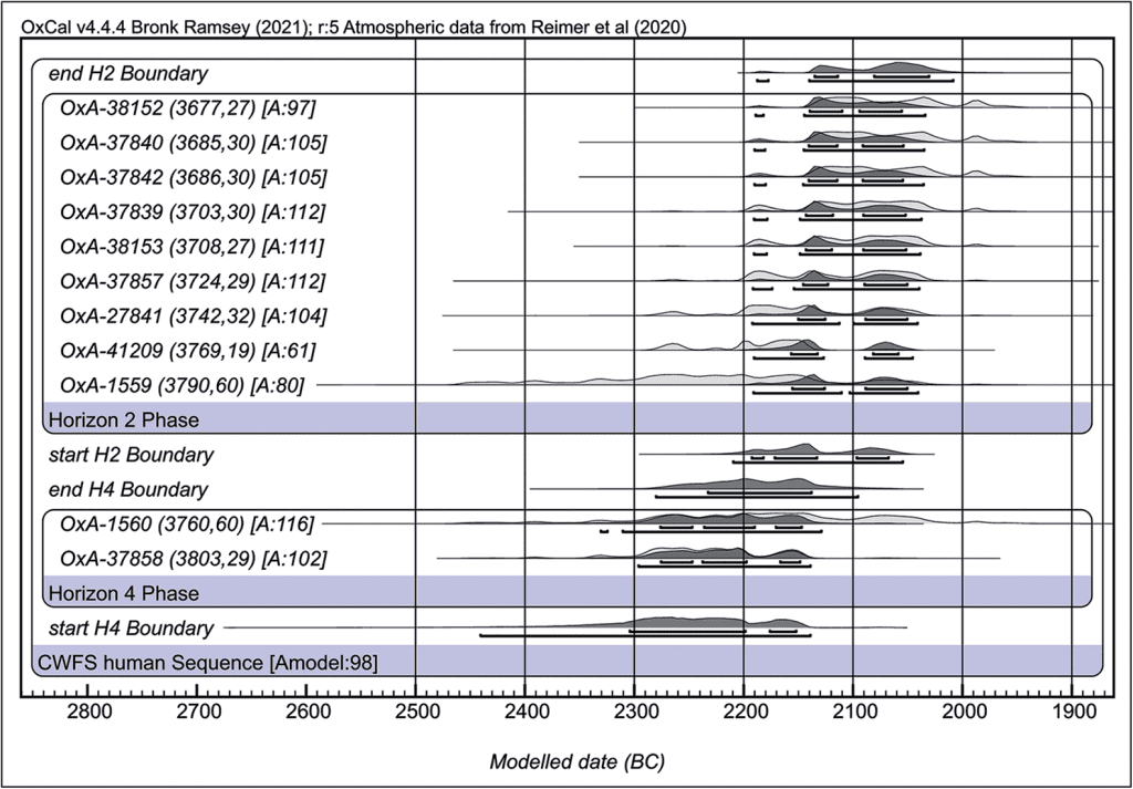 Penanggalan radiokarbon menunjukkan usia yang konsisten antara 2343 dan 2036 SM, meskipun ada perbedaan antara Horison 2 dan 3.