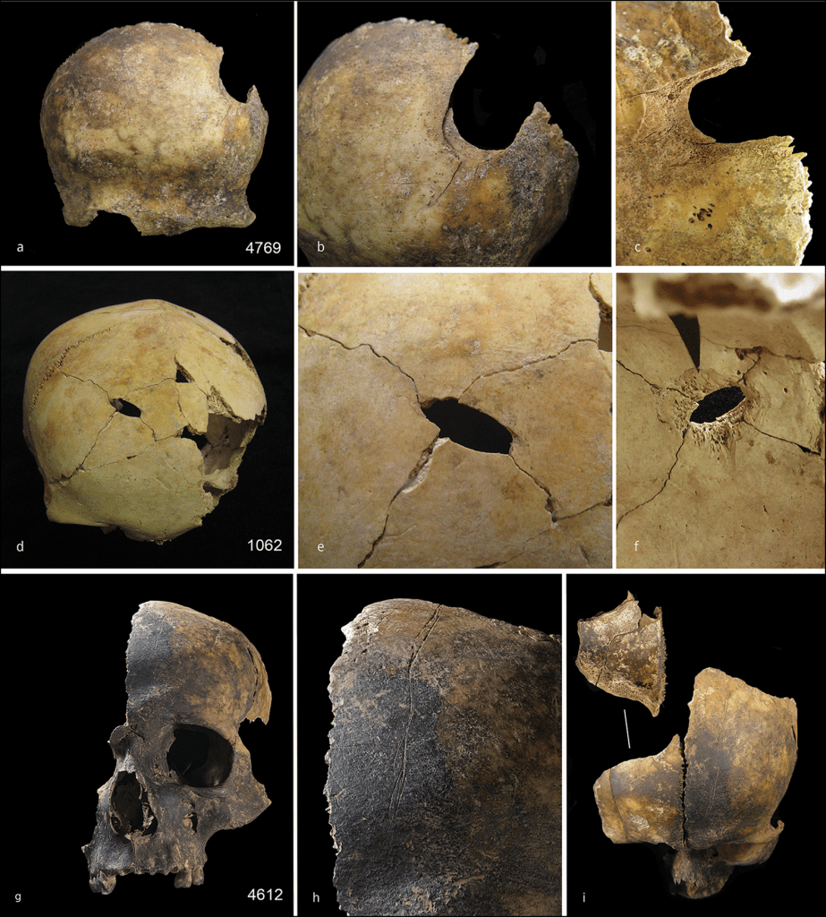 Contoh trauma kranial. Atas) Cedera perimortem pada bagian posterior kiri tulang frontal (a), bekas sayatan juga terlihat pada tulang frontal (b), dan bevel berpatina pada permukaan internal kranial tampak di sekitar area cedera (c); tengah) Tengkorak dengan cedera tembus pada tulang frontal tengah (d), tampak lebih dekat menunjukkan garis-garis retakan yang menyebar (e), dan pandangan internal menunjukkan bevel berpatina (f); bawah) Tengkorak dewasa (g), pemeriksaan lebih dekat menunjukkan bekas sayatan yang membentang di sepanjang tulang frontal tengah (h) dan patahan akibat trauma tumpul perimortem pada fragmen tulang frontal kanan yang menyatu (i). (Gambar: Cambridge University).