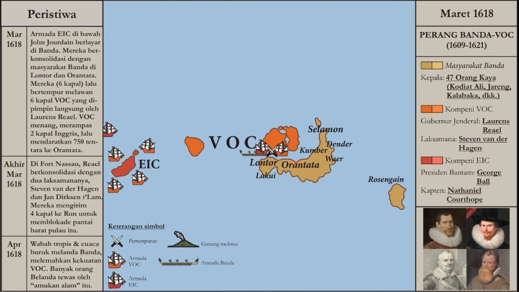 Awal April 1609, Gunung Api di Pulau Gunung Api meletus, menimbulkan hujan abu yang menimpa Pulau Banda Neira. Pada saat yang hampir bersamaan, tanggal 8 April, muncullah sebuah armada sebanyak 13-14 kapal. Ini adalah armada milik Kompeni VOC (Vereenigde Oost-indische Compagnie), perusahaan monopoli dari Belanda itu. Armada ini diperintahkan oleh para tuan tujuh belas, Heeren Zeventien, untuk memenangkan pulau-pulau penghasil cengkih dan pala, “baik dengan cara perundingan ataupun kekerasan”. Artinya, Kepulauan Maluku, terkhusus Ternate dan Banda. Ternate – sebuah kesultanan besar yang mulai bobrok – telah “diamankan” sebagai sekutu, yang akan semakin bergantung kepada VOC untuk menghadapi penjajahan Uni Iberia (persatuan Spanyol-Portugal) yang sedang berlangsung di sebagian besar Indonesia Timur. Namun, Banda tetap merdeka. Ia menjadi “zona bebas” terakhir di Maluku. Inilah mengapa armada VOC mendatanginya.